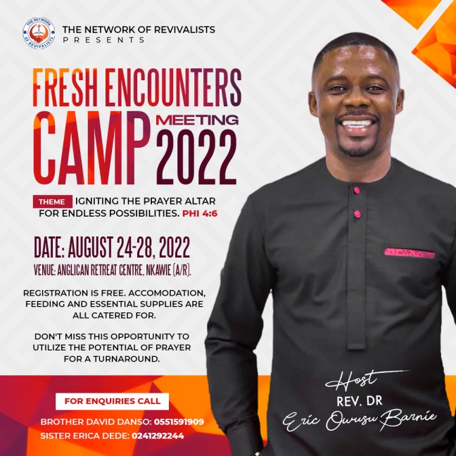 After a refreshing Camp meeting in December 2021, we had to wait for 8 long months according to our usual schedule for another camp meeting. The August 2022 Camp meeting started on the 24th and ended on the 28th under the Theme "Igniting the Prayer Altar for Endless Possibilities". We delved into dimensions of prayer … Continue reading AUGUST 2022 CAMP MEETING