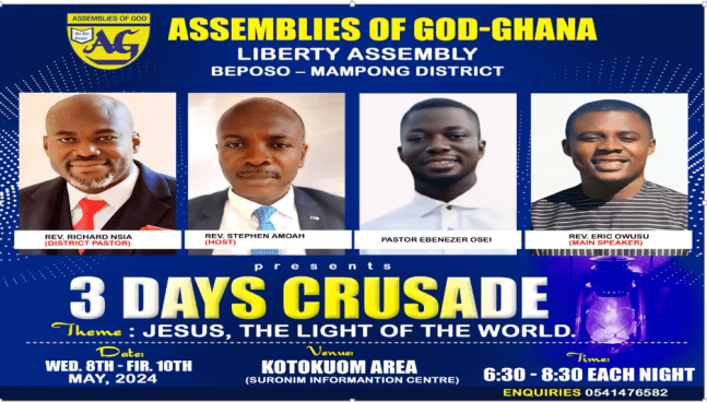 On May 8th to 10th 2024, our team joined the Mampong Beposo Assemblies of God to do 3 day crusade under the theme "Jesus, the Light of the World". This Outdoor event witnessed profound exposition of truth from the word of God. The concept of Light, its characteristics and connection to the scriptures were taught … Continue reading BEPOSO KOTOKUOM CRUSADE, 2024