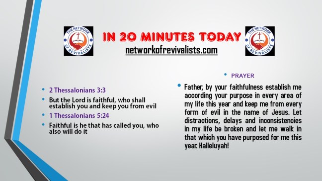 Precious partner, we believe that God is preserving you. Thank you for deciding to fast and pray with us.Fasting ends on February 2. Fast according to your capacity. You can go 3 full days without food and water, 3 days with water, or eating lightly once a day for the 3 days.Ensure that you pray … Continue reading JANUARY 31- FEBRUARY 2 FASTING AND PRAYERS